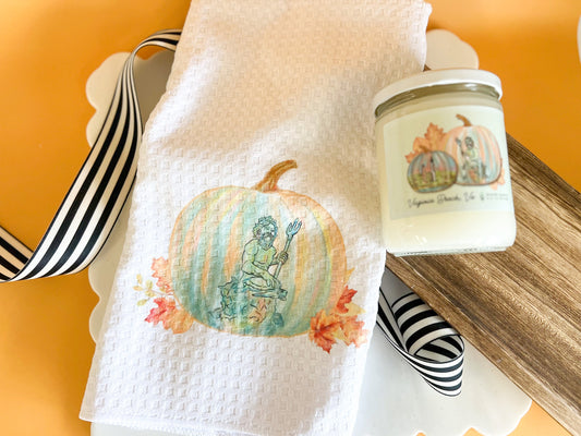 King Neptune Statue tea towel and Seaside Harvest candle bundle