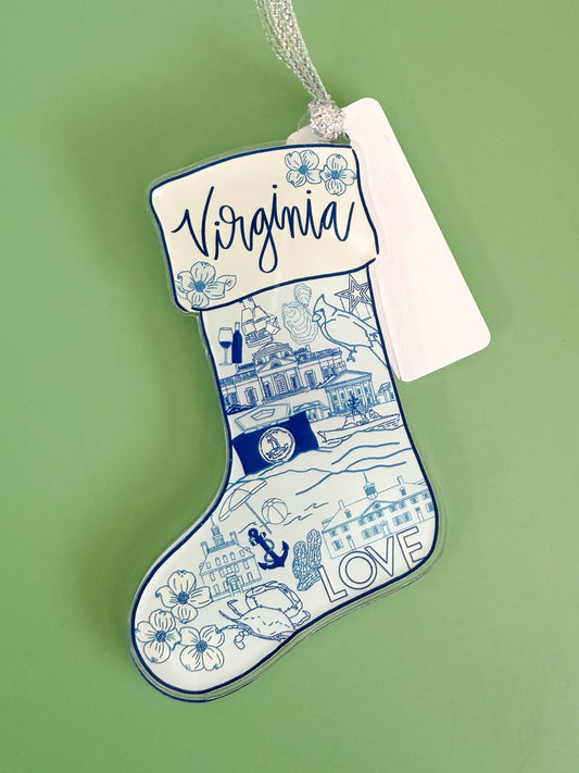 Virginia Blue and White Stocking Acrylic Ornament - VA