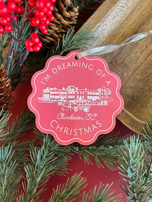 Charleston,SC Christmas Ornament - Pink Acrylic Scalloped - Rainbow Row Ornament - Bachelorette Gift