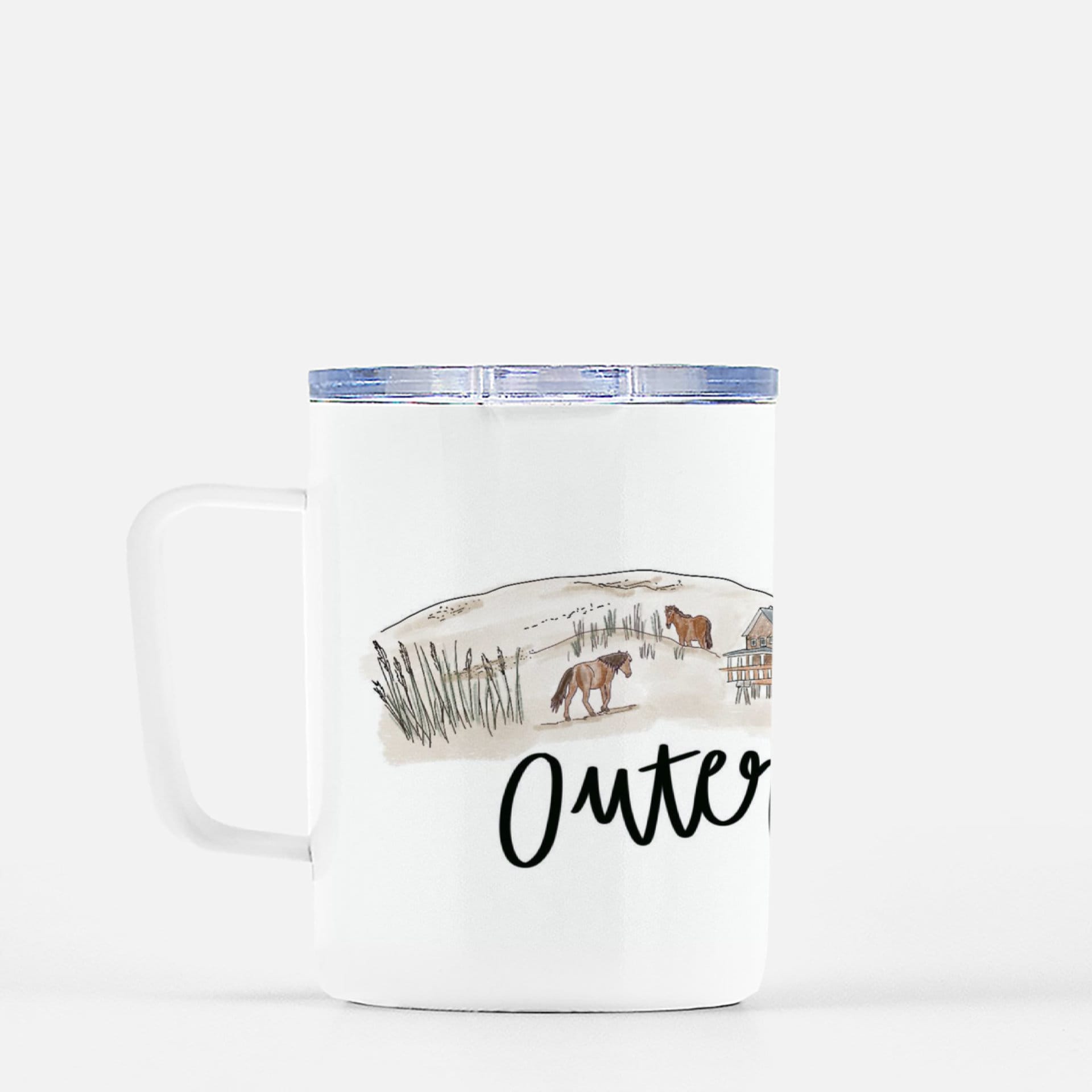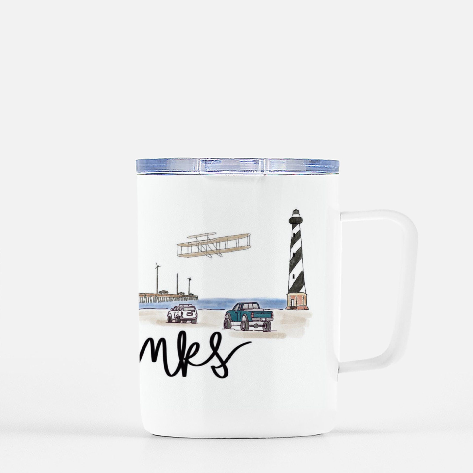 Share your love for the Outer Banks of North Carolina with this beautiful skyline mug. A classic handled mug with a travel lid in stainless steel! Easy to hold and convenient to carry from home to office. Keeps beverages warm or chilled.