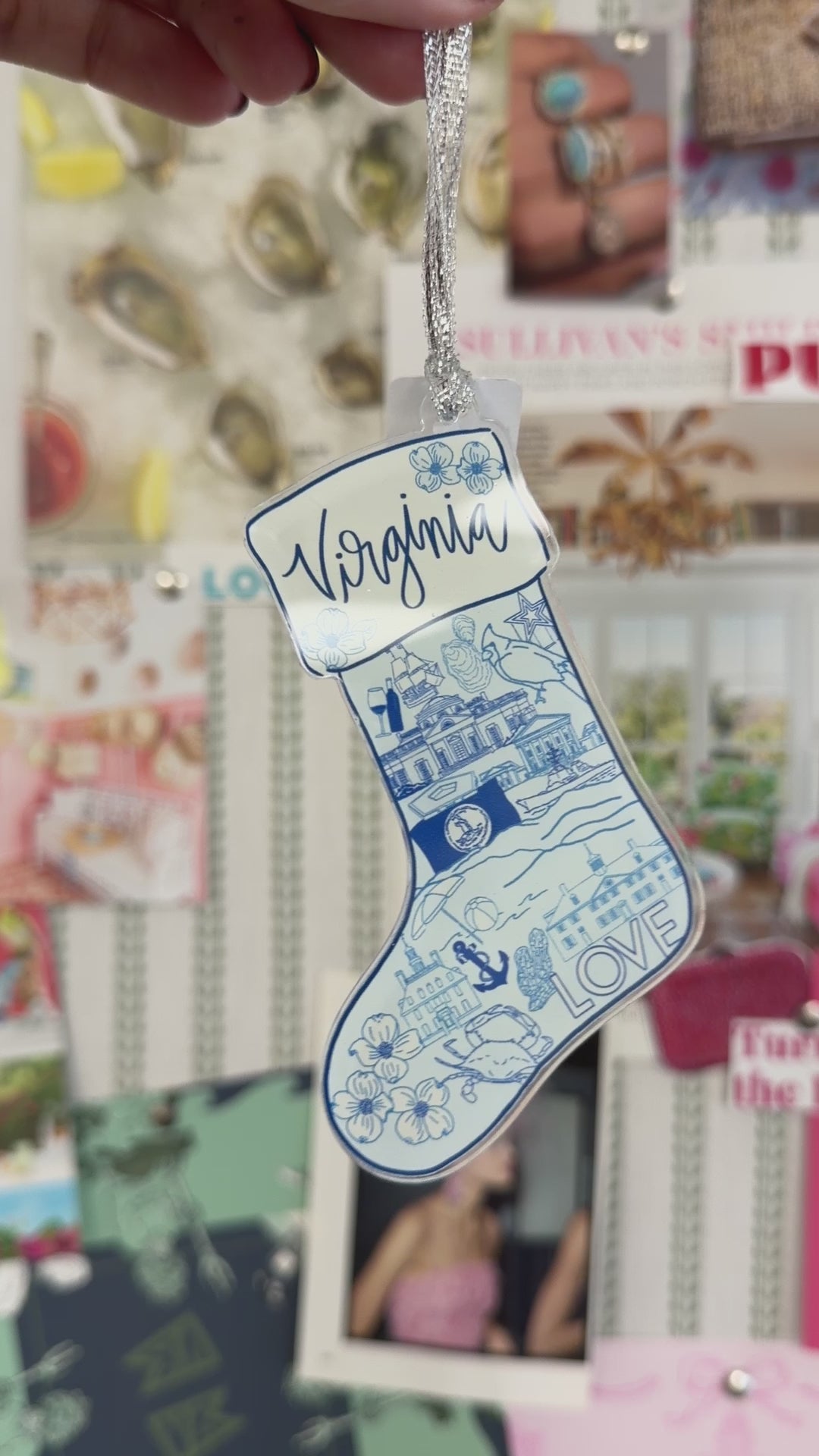Celebrate the charm of the Old Dominion with this beautifully hand-drawn Virginia Stocking Ornament. Featuring iconic Virginia landmarks and symbols—from the Blue Ridge Mountains to the coast—this collectible ornament captures the spirit of the state in a timeless blue-and-white design.