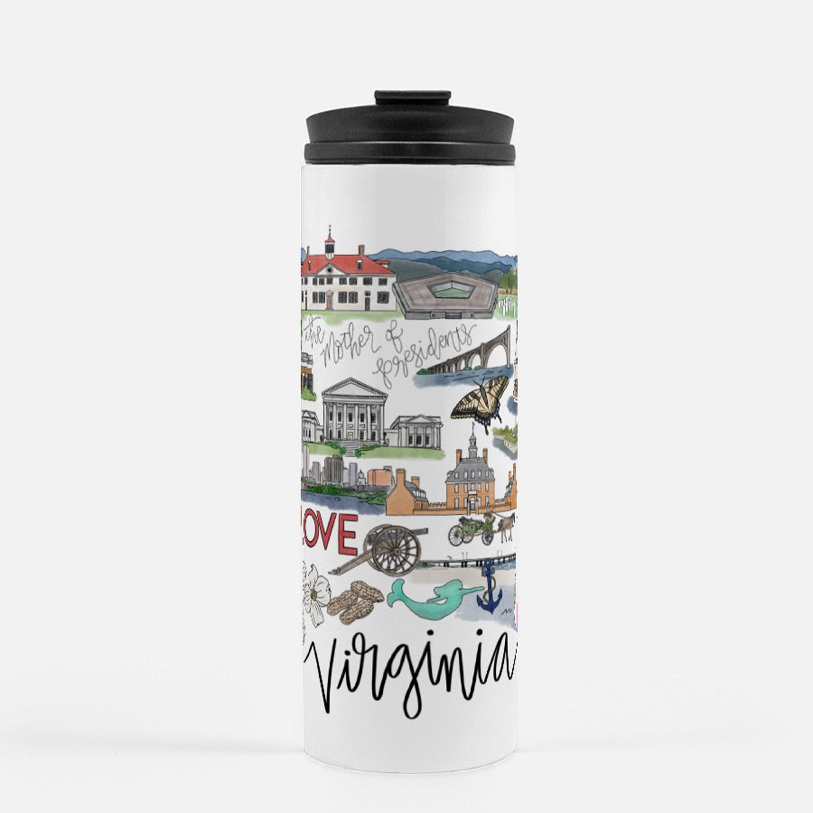Cold or hot beverage? You can have either in this convenient thermal tumbler! It's durable for an on-the-go lifestyle and seals well to prevent leaks. It features a hand drawn design that depicts several of Virginia's landmarks. This is a full color design that is stunning in person!
